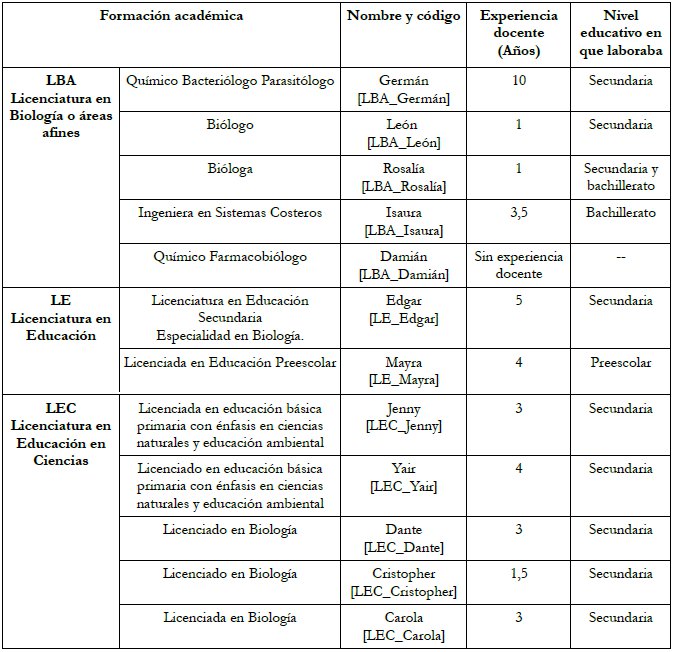 Licenciatura en Educación (LE): Dos EP tenían formación inicial en escuelas normales mexicanas formadoras de docentes, con programas que enfatizan asignaturas de pedagogía general para un nivel educativo y pedagogía en áreas específicas, sin una formación disciplinar en biología muy sólida.