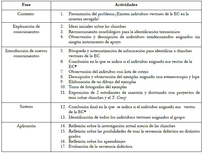 En este contexto, la secuencia didáctica propuso a los participantes el desafío de determinar si la chinche que les había sido asignada era o no un vector de la EC. Ésta incluía 17 actividades estructuradas en 4 fases: Exploración de conocimientos, Introducción de nuevos conocimientos, Síntesis y Aplicación (Sanmartí, 2005). Para la implementación de la secuencia didáctica se utilizaron 3 sesiones con una duración de 3 horas. En la tabla 1 se presenta una descripción general de las actividades.