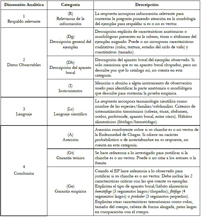 El análisis de los datos fue realizado considerando la propuesta del análisis del contenido (Bardin, 2002). El corpus estuvo constituido por las producciones individuales de los EP en las actividades 6 y 12 (Ver tabla 1). Las respuestas a la pregunta 6 las consideramos como el Momento 1, pues son elaboradas a partir de la observación de su ejemplar sin instrumentos y apoyados en una primera búsqueda de información sobre vectores de la EC. Las respuestas a la pregunta 12 se consideraron el Momento 2, que son influenciadas por la observación de sus ejemplares utilizando lupas y/o estereoscopios (observación más fina) y una lista de cotejo de características relevantes a observar en los ejemplares (incluido el aparato bucal). Otra actividad crítica entre los momentos 1 y 2, por la introducción de información relevante, fue la exposición por parte de investigadores en formación sobre chinches Triatominos. Los textos de las actividades 6 y 12 fueron las respuestas a las siguientes preguntas específicas: