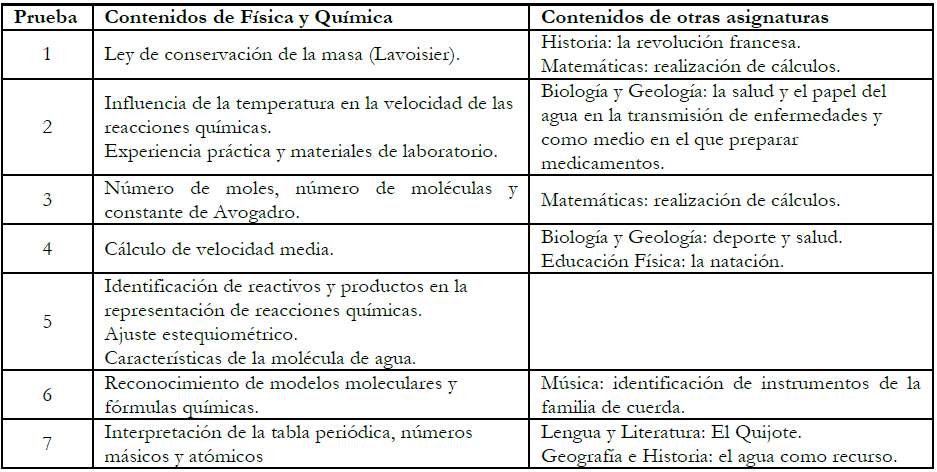 El agua apareció como punto común entre algunas de las asignaturas. Como valor añadido, también puede tratarse desde el punto de vista medioambiental y como un compuesto fundamental para la vida y la salud. Por otro lado, los instrumentos de cuerda y El Quijote aparecerían incluidas como parte de las pruebas a resolver. La asignatura de Inglés se utilizaría directamente como lengua en algunas partes y la de Matemáticas se consideraría involucrada a la hora de hacer los cálculos de los problemas.