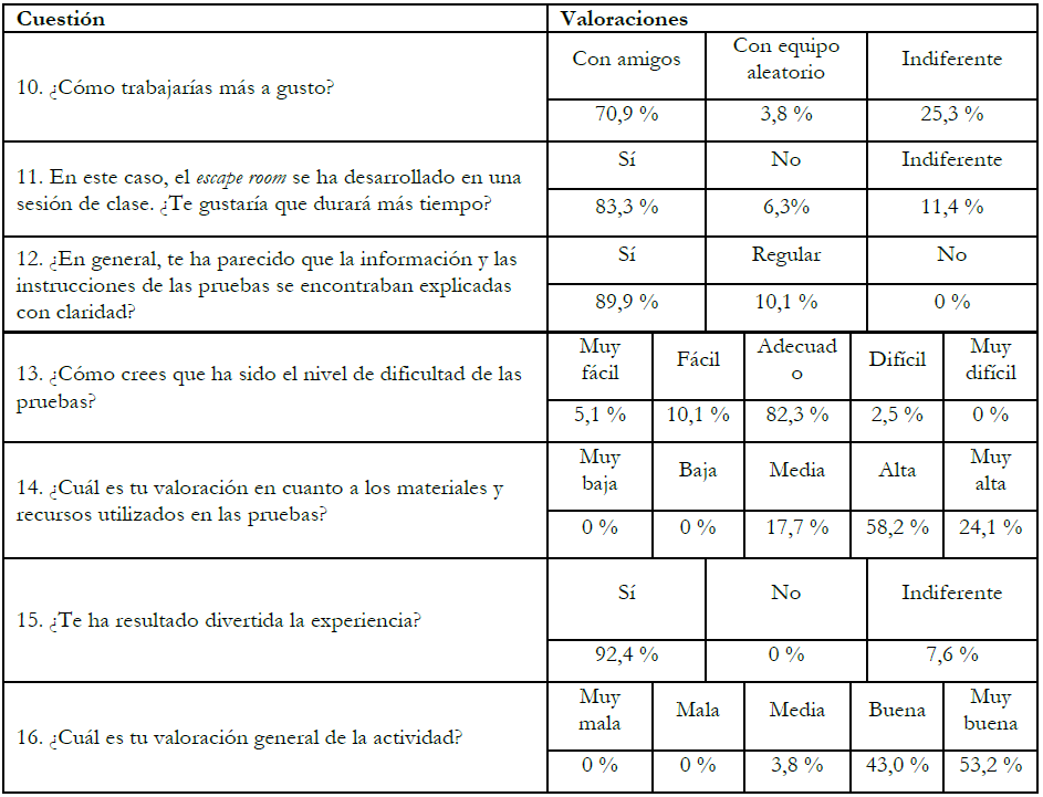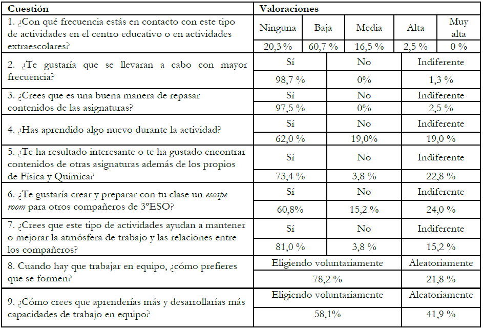 Las profesoras mencionaron que alumnos que habían manifestado cierto desinterés durante el resto del curso habían cambiado totalmente su actitud cuando participaron en la sesión. También se reflexionó sobre el poder que podía tener el uso de metodologías distintas a las que se usan habitualmente para llegar a conocer más a los estudiantes en distintos contextos. La respuesta positiva de los alumnos, la actitud participativa y la motivación observada también aparecieron en mayor grado de lo que se contemplaba en las expectativas. Se esperaba observar a más estudiantes que mostraran indiferencia o que no respondieran con motivación ante la actividad. De igual manera, el análisis de los datos recogidos mediante el cuestionario ha puesto de manifiesto un impacto bastante positivo de la implementación del escape room en este contexto educativo.