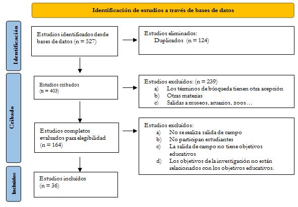 El proceso de selección de artículos se resume en el diagrama de la Figura 1, adaptado de la guía PRISMA para la revisión sistemática de trabajos (BMJ 2021). Primeramente, se buscaron artículos que abordaran las salidas de campo en una selección de cinco revistas estatales y cinco internacionales entre las más relevantes del área de Didáctica de las Ciencias (Tabla 1). De ellas dos son específicas de Didáctica de la Geología.