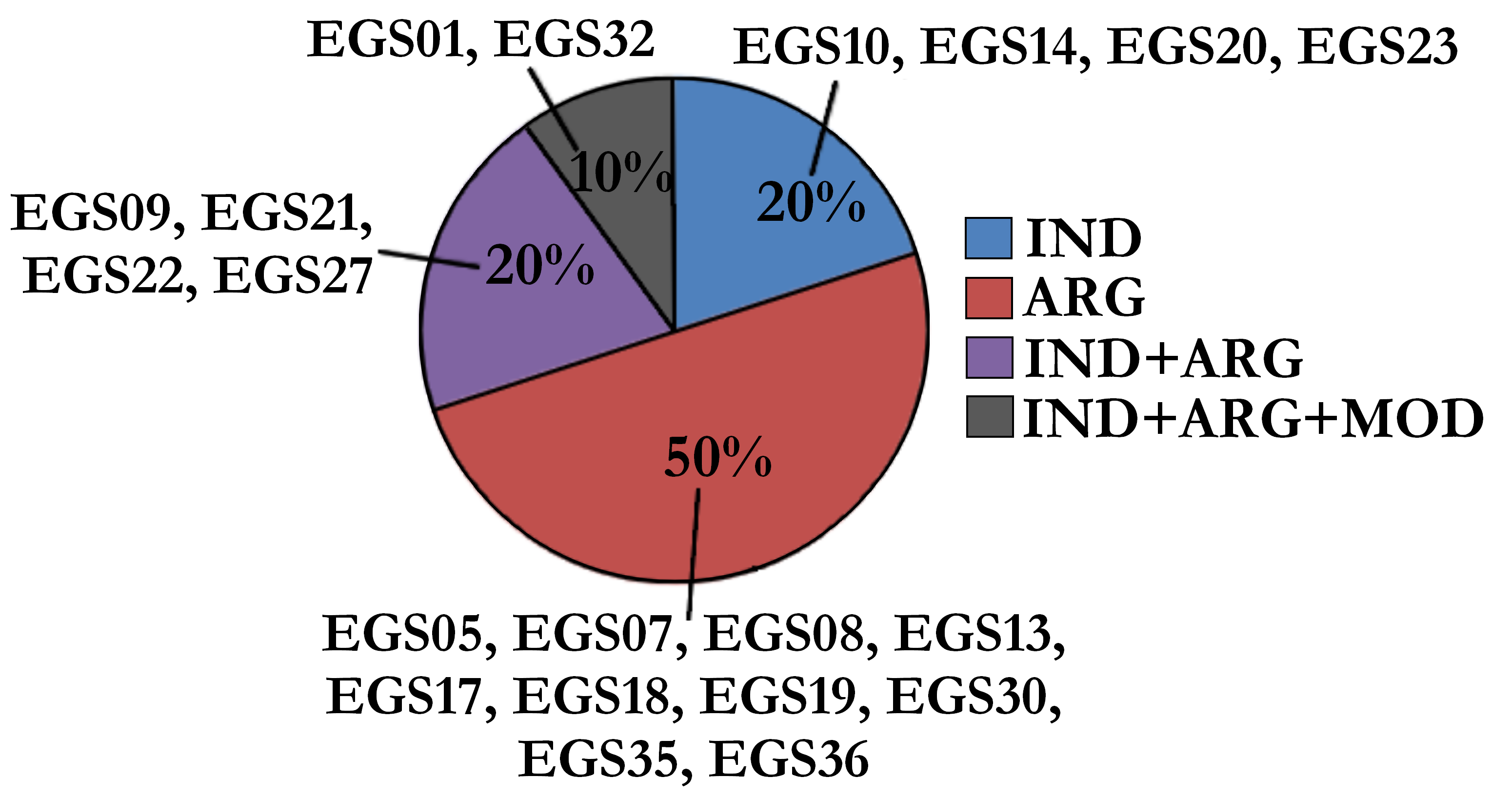Cuatro operaciones (IND7, ARG2, ARG3, ARG4) se mencionaron en la mitad o más de las 20 EGS (figura 5). Por otro lado, a 13 operaciones se aludió en dos o menos EGS. A continuación, se muestran los resultados desglosados por práctica científica.