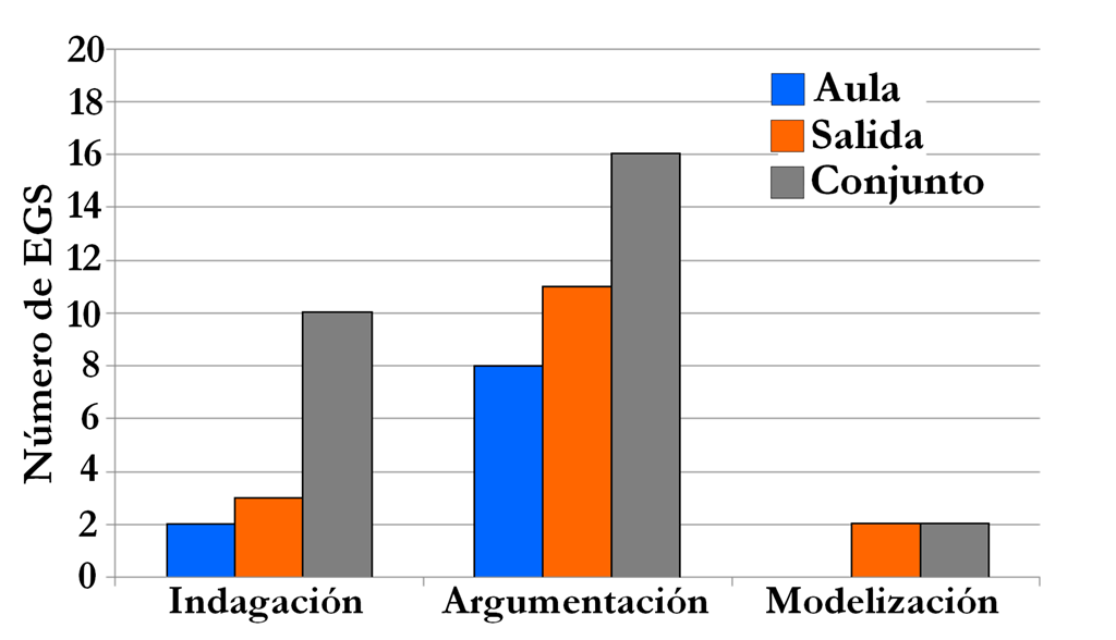 Primeramente, se muestra en la figura 3 el número de EGS en las que se identificaron evidencias de realización de las prácticas científicas (más de dos operaciones diferentes), tanto en las actividades realizadas en el aula como en las realizadas en la salida, como en conjunto (en la salida, en el aula o en ambas).