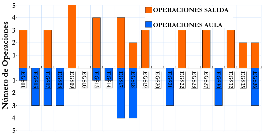 En la figura 4 se muestra el número de operaciones identificadas en cada EGS tanto en la salida como en el aula. Como se observa en la figura 4, la mayor parte de las EGS refirieron operaciones tanto en el aula como en la salida. De hecho, en 10 se mencionaron más en el aula que en la salida, en 9 más en la salida y en uno en igual número. Destaca que en 7 EGS se mencionaron más de cinco operaciones en la salida y en dos, más de cinco operaciones en el aula.