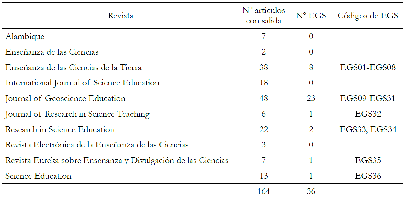 La búsqueda se hizo a través de bases de datos seleccionando el rango temporal 2011-2020 y limitando la búsqueda a las revistas mencionadas. Se buscaron los términos “salida”, “trabajo de campo”, “itinerario”, “campo” para las revistas en castellano y “trip”, “field work”, “itinerary”, “outside”, “outdoor” y “land” para las revistas en inglés en el título y resumen de los artículos. Se localizaron 403 trabajos en los que se mencionaran esos términos (después de eliminar los duplicados). Tras una lectura superficial, se excluyeron aquellos en los que los términos tenían otras acepciones (p. ejemplo “campo magnético terrestre”) y los artículos sobre materias alejadas de las ciencias de la Tierra. Tampoco se consideraron las salidas a equipamientos tales como museos, acuarios, zoos u otro tipo de equipamientos similares, ya que el campo se ciñe más al ámbito de trabajo geológico (Pedrinaci 2012; Mogk y Goodwin 2012; Petcovic et al. 2014). Finalmente se seleccionaron 164 artículos para una lectura completa (tabla 1).
