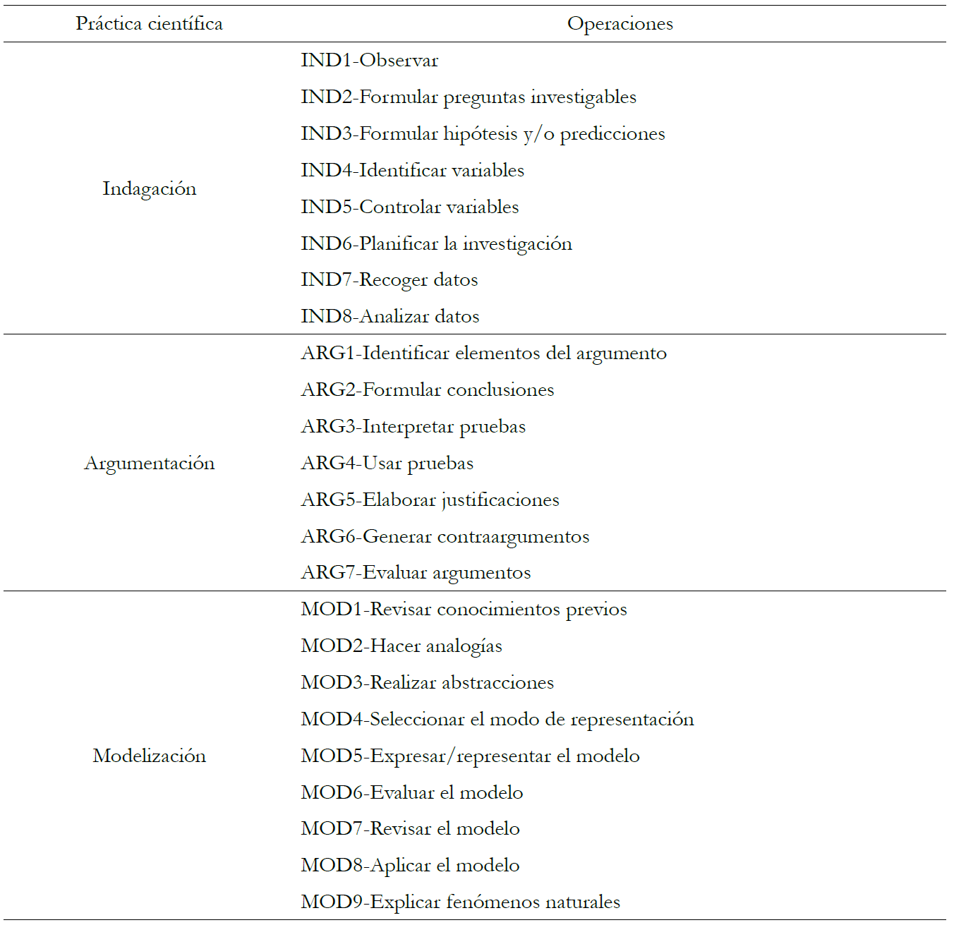 Las 36 EGS fueron analizadas por los tres autores. Para determinar la alusión al desarrollo de prácticas científicas, se elaboró un listado de operaciones (tabla 2) que según los referentes teóricos se incluyen en las prácticas de indagación (Bargiela et al. 2018, Ferrés et al. 2015, Harlen 2014, Jiménez-Aleixandre y Crujeiras 2017, NRC 2012, Pedaste et al. 2015, Schalk et al. 2013), argumentación (Bargiela et al. 2018, Chang y Chiu 2008, Erduran et al. 2004, Jiménez-Aleixandre 2010, Jiménez-Aleixandre y Crujeiras 2017, NRC 2012, Osborne et al. 2016) y modelización (Bargiela et al. 2018, Garrido 2016, Gilbert et al. 2000, Jiménez-Aleixandre y Crujeiras 2017, NRC 2012, Schwarz et al. 2009).