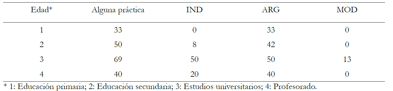 Los resultados de la tabla 3 muestran que la proporción de EGS en las que se identificaron dos o más operaciones relacionadas con las prácticas científicas fue mayor cuanto mayor era la edad de los participantes en las experiencias, con la salvedad de las experiencias en que participó profesorado en formación. Esta relación fue más acusada en el caso de la indagación y la modelización, para las que se identificaron muy pocas experiencias fuera del ámbito universitario, pero con una relación más igualitaria en el caso de la argumentación. Respecto a las operaciones, algunas destacaron por la diferencia según la edad y en otras la edad pareció no influir. Así, IND7-Recoger datos fue la operación más mencionada en todos los grupos de edad sin apenas diferencias (entre un 67% y un 80% de estudios la citaron), mientras que en el caso de IND8-Analizar datos sí hubo diferencias por edad. Sin tener en cuenta las experiencias con profesorado, se hallaron correlaciones estadísticamente significativas entre la edad y la práctica de indagación (r= 0,454 significativa al 0,01), y la operación IND8-Analizar datos (r=0,358 significativa al 0,05). En cuanto a las operaciones de argumentación, su mención fue bastante equilibrada (31-50%) entre los grupos de edad en el caso de ARG2-Formular conclusiones, ARG3-Interpretar pruebas y ARG4-Utilizar pruebas; sin embargo se observó una diferencia no significativa según la edad (0, 17%, 25%, 40% respectivamente) para ARG5-Elaborar justificaciones.
