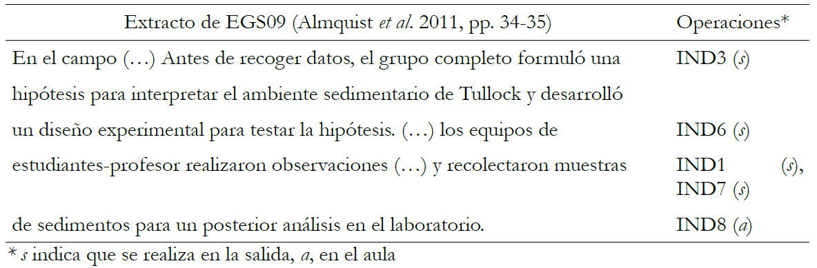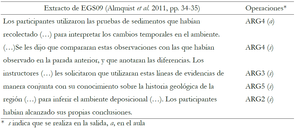 Las 20 EGS mencionaron al menos alguna operación de indagación. La mitad de ellas combinaron la alusión a operaciones en las actividades de la salida y las del aula. Del resto, solo 9 las mencionaron en las de la salida y una en las del aula. En la tabla 4 se muestra un fragmento de EGS09, en la que más operaciones de indagación en la salida se identificaron. En EGS09 (Almquist et al. 2011), los participantes (profesores/as) realizaron diversas operaciones relacionadas con la argumentación (que se muestran más adelante) y la indagación para interpretar el ambiente sedimentario en el que realizan la salida, que consta de varias paradas.