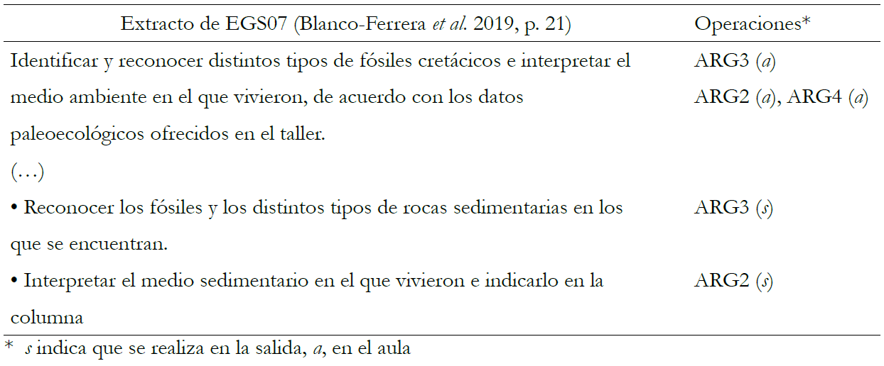 17 EGS mencionaron al menos alguna operación de argumentación. En 6 se explicitaron tanto en la descripción de la salida como en la de las actividades de aula. En 6 exclusivamente en la salida, y en 5 solo en el aula. En las tablas 5 y 6 se muestran fragmentos de EGS09 y EGS07. En EGS07 (Blanco-Ferrera et al. 2019) casi cien alumnos de 4º de la Enseñanza Secundaria Obligatoria (ESO) y de la asignatura Geología de 2º curso de Bachillerato realizaron actividades en el aula y en el campo (costa asturiana) para, a partir de fósiles del Cretácico, identificar los distintos medios sedimentarios registrados, e inferir las situaciones de transgresión y regresión del mar.