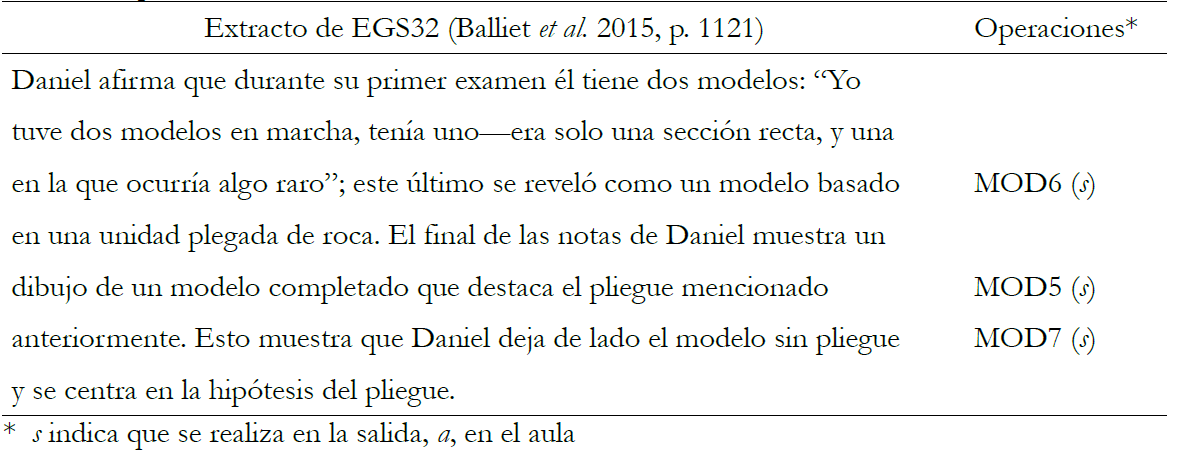 Fueron solo 10 las EGS (la mitad) que mencionaron alguna operación relacionada con esta práctica. Dos EGS explicitaron operaciones de modelización tanto en la salida como en el aula. En EGS32, de la que se muestra un extracto en la tabla 7, estudiantes universitarios realizaron un examen individual en el campo, en el que debían construir el modelo geológico de una zona determinada (Balliet et al. 2015).