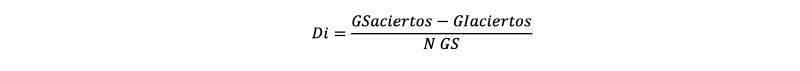 En este caso, Di representa el índice de discriminación; Gsaciertos es el Grupo Superior de aciertos, es decir, el número de aciertos para el ítem i, por el 25 % (primer cuartil) de los participantes con más aciertos en este apartado del cuestionario; GIaciertos el Grupo Inferior de aciertos, es decir, el número de aciertos para el ítem i, por el 25 % (cuarto cuartil) de los participantes con menos aciertos en este apartado del cuestionario; y, por último, N GS hace referencia a los sujetos en el grupo mayor Gs o Gi.