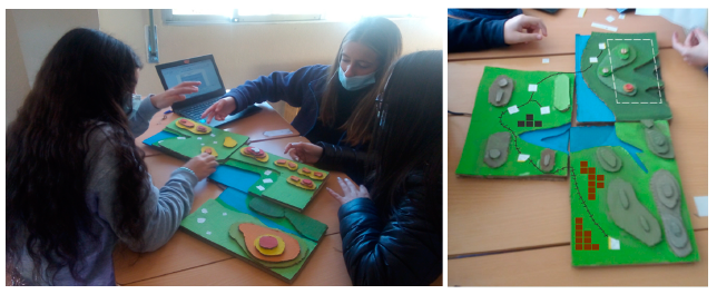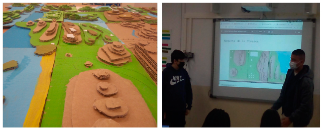 Las presentaciones finales elaboradas por el alumnado fueron de interés porque, además de usar la pantalla de proyección, el alumnado usaba la maqueta de su comarca para indicar los puntos críticos y la adopción de medidas (Figura 5). El alumnado identificó distintos errores en su urbanización inicial (“Hemos situado esta ciudad en el valle del río, Hay demasiadas carreteras, No habíamos pensado que esta pendiente podría ser un peligro para las fábricas”).