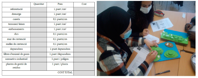 Después de una presentación teórica (Tecnología) sobre los tipos de medidas estructurales preventivas (mallas de contención, drenajes, diques…), cada equipo debía identificar qué medidas podían aplicarse para mitigar los riesgos de su comarca. Cada equipo contó con un presupuesto de 15 puntos y tuvo que discutir qué medidas adquirir a partir de un catálogo simplificado elaborado ad hoc para la actividad (Figura 4).