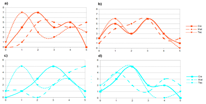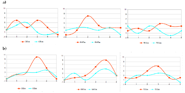 En relación con las percepciones del alumnado en referencia a la utilidad de esos aprendizajes de las tres áreas para la vida diaria o para la vida profesional, se aprecian diferencias entre alumnos y alumnas (Figura 7). Al ser preguntado sobre la utilidad de las distintas prácticas para la vida cotidiana, el alumnado da mayor importancia a las prácticas de las matemáticas que a las de la ciencia, y menor importancia a las de la tecnología (las diferencias son más evidentes en las respuestas de las alumnas). Hay una diferencia interesante al pasar a posicionarse sobre la importancia para la vida profesional. El alumnado masculino muestra cambios ligeros, que normalizan un poco la distribución y tienden a incrementar moderadamente la importancia de las tres áreas. En cambio, entre las alumnas disminuye mucho la importancia de las tres áreas respecto a la que mostraban para la vida cotidiana.