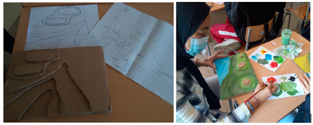 El alumnado acogió con interés el punto de partida de la actividad por su componente creativa, y mantuvo el interés durante la identificación de formaciones y procesos para enriquecer su paisaje. La reproducción del paisaje en forma de mapa topográfico fue un momento interesante, porque provocó preguntas del tipo “¿Dibujo la roca alveolada? o ¿Hay que poner los árboles?”, que ayudaron a concretar la orientación de este tipo de mapas a la descripción del relieve a nivel macro, y la eliminación de la cobertura vegetal en la representación (Figura 1). El mapa topográfico fue de utilidad para discutir distintos aspectos como la pendiente en determinados puntos del territorio, o la huella reconocible en el relieve de los cursos fluviales. Con el alumnado se discutió el interés de conservar ambas representaciones (paisaje y mapa topográfico) por integrar distintos tipos de informaciones sobre un mismo territorio.