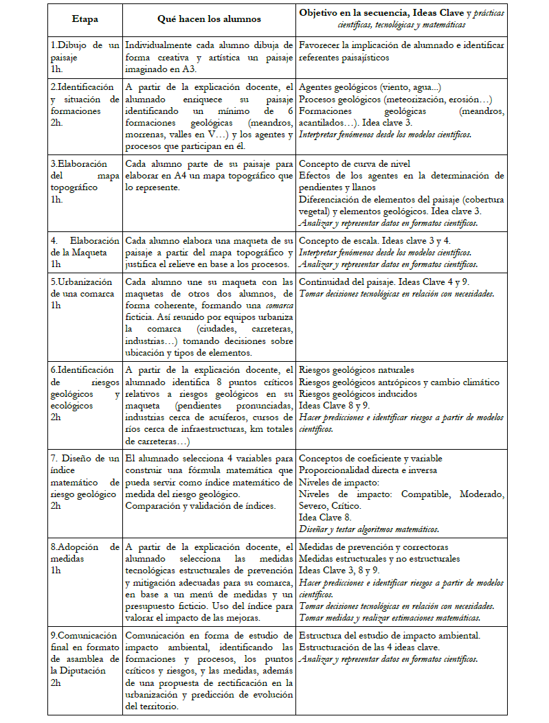 Una de las ideas de partida para el diseño fue el hecho que gran parte del alumnado tiene una relación poco cordial con la Ciencia. Para atender esa dificultad, y tomando en consideración lo descrito sobre STEM en la introducción, consideramos que introducir actividades artísticas o que incorporaran la perspectiva de los cuidados podría ayudar a implicar a todo el alumnado (como han propuesto otros autores –Couso, 2017-). La constatación, en la lectura de Llorente y Laín (2003), de que uno podía imaginar los riesgos en escenarios todavía no existentes llevó a la idea central del proyecto: que el alumnado partiera de un paisaje imaginado creativa y artísticamente por sí mismo (incluyendo distintos agentes, procesos y formaciones), simulara su urbanización y -como responsable de las personas que lo habitarían- realizara un análisis de impactos y riesgos geológicos. Esto permitiría incluir las perspectivas artísticas y de cuidados, resultando en un Estudio de Caso, que integraría los riesgos geológicos naturales, los riesgos geológicos inducidos y los riesgos ecológicos antrópicos.