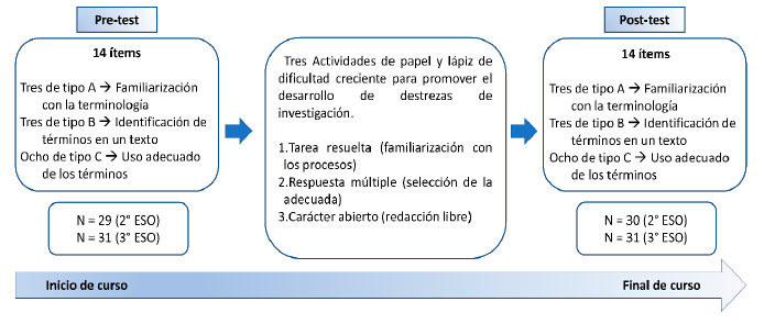 Con la finalidad de determinar el grado de adquisición de las distintas destrezas de investigación, al inicio del estudio, se implementó un cuestionario semiabierto, diseñado como pre-test, y estructurado en torno a pequeñas investigaciones escolares. El cuestionario elaborado por Cordón (2009) fue tomado como referencia y adaptado a los contenidos de las asignaturas implicadas. Posteriormente, se ponen en práctica las actividades descritas en el apartado de resultados y, tras ellas, se implementa el mismo cuestionario a modo de post-test (Figura 1).