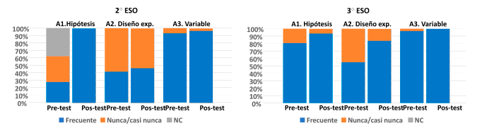 Comparando la percepción del alumnado sobre sus conocimientos acerca de las hipótesis, el diseño experimental y las variables, antes y después de la realización de las actividades, se observa una mejora en los 3 términos y para los dos cursos, aunque son especialmente destacables los cambios experimentados en el ítem de hipótesis en 2º ESO y de diseño experimental en 3º ESO, ya que muestran diferencias estadísticamente significativas (Figura 2). Se observa también que el término variable es con el que el alumnado de todos los cursos se siente más familiarizado, ya que, en todos los casos, más del 90% afirmaron haberla usado de forma frecuente, alcanzando un porcentaje del 100% en el post-test con el alumnado de 3ºESO.