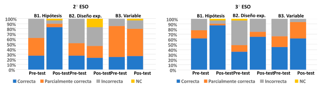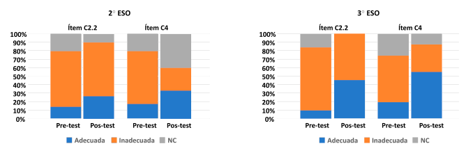 Respecto al diseño experimental, los datos de los ítems C2.2 y C4 de la figura 6 demuestran que es una de las destrezas que inicialmente resulta más costosa para el alumnado y que la realización de las actividades mejora su aprendizaje, hasta un 30% aproximadamente en 2º ESO y ligeramente por encima del 50% en 3º ESO, curso en el que se daban respuestas más elaboradas y se proponía el estudio de más variables.