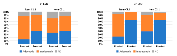 Los resultados de la figura 4 muestran que entre un 77.5 y un 86.2% del alumnado de 2º y 3º ESO ha presentado dificultades para reconocer el problema de la investigación (C1.1 y C2.1) antes de realizar las actividades, bien porque su respuesta no atendía al problema de la investigación o bien porque incluían parte de los resultados en el mismo (tabla 2).