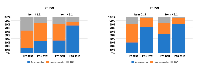 Los datos evidencian que todas las destrezas mejoran en gran medida tras ser trabajadas de forma guiada a lo largo de la secuencia de actividades, con la excepción de los ítems C2.1 y C4 para 2º ESO.
