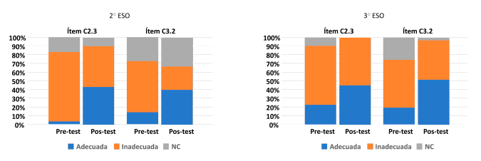 Los ítems C2.3 y C3.2 versan sobre la obtención de conclusiones. Los resultados demuestran las dificultades para establecer conclusiones justificadas. La realización de las actividades mejora los resultados logrando un porcentaje de aciertos entre el 40-50% de todo el alumnado, independientemente del ítem o el curso (Figura 7).