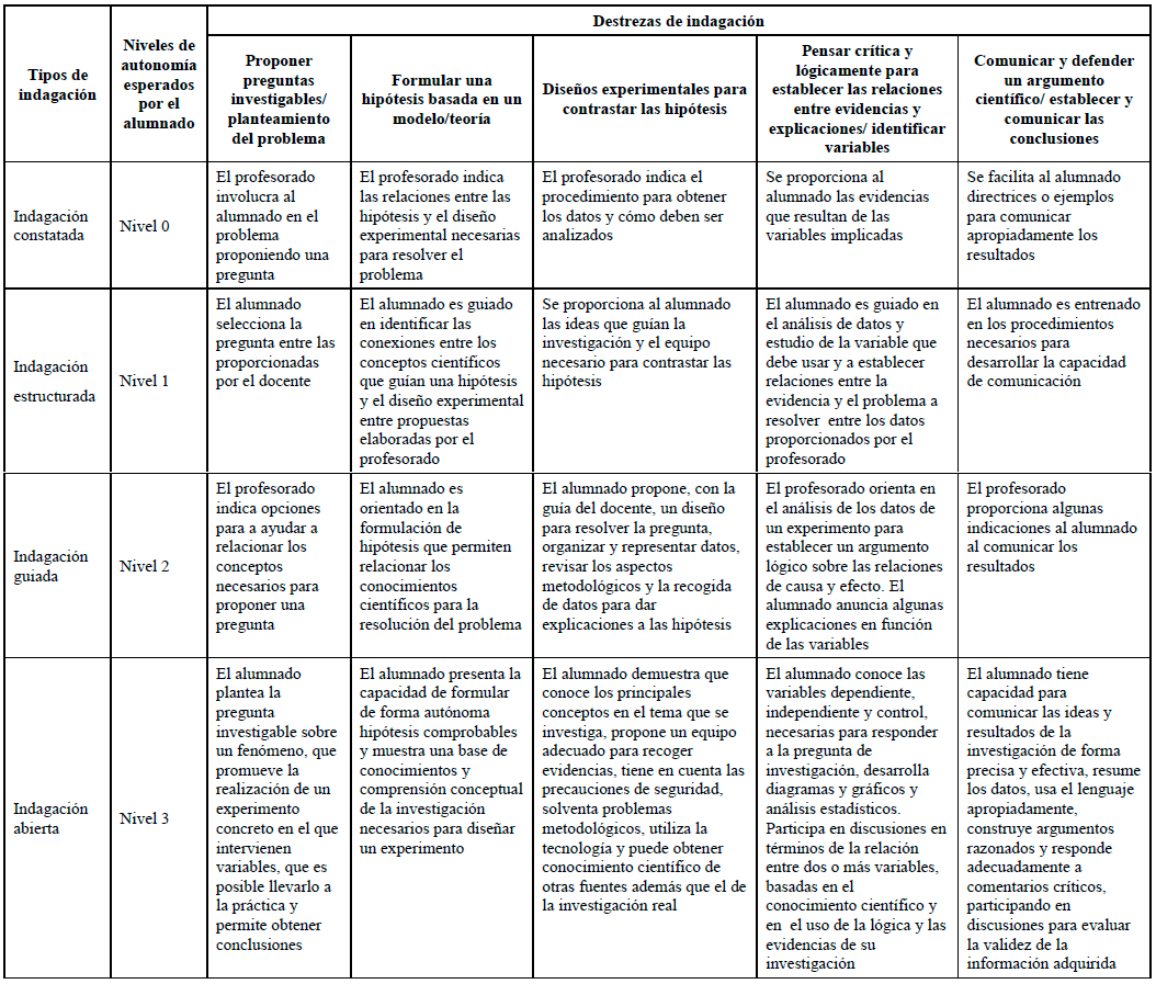 Pese a su importancia, es innegable que la implementación de este tipo de actividades con los escolares conlleva dificultades de aprendizaje, que se incrementan a medida que aumenta el grado de autonomía que adquiere el alumnado (Grau, 1994). Recientemente, se ha establecido que las estrategias docentes influyen directamente en el desarrollo de las destrezas científicas del alumnado, siendo necesario profundizar en la relación entre el andamiaje específico requerido al abordar investigaciones semiabiertas y la mejora de destrezas (Crujeiras y Jiménez Aleixandre, 2018; Tena y Couso, 2022). Crujeiras y Jiménez (2018) analizaron el impacto de determinadas estrategias docentes en los desempeños del alumnado relativos al diseño y puesta en práctica de investigaciones científicas, indicando la necesidad de no cerrar el nivel de apertura del proceso por parte del alumnado. Es por ello que resulta adecuado adentrar a los escolares en estas destrezas mediante una progresión de aprendizajes de indagación (National Research Council, 2000, 2012). En esta línea, varios estudios han propuesto distintos tipos de indagación en función del nivel de dificultad (Contrera et al., 2019; Martin- Hansen, 2002). La categorización realizada por Contrera et al. (2019) distingue cuatro tipos de indagación en orden creciente de la autonomía que se espera por parte del alumnado: i) indagación constatada, es la que requiere una mayor dirección por parte del profesorado, se podría considerar como una lección por pasos y es útil para iniciar al alumnado en la familiarización con distintas destrezas de investigación; ii) indagación estructurada, en la que el profesorado asigna la pregunta de investigación y el procedimiento y apoya al alumnado en su resolución, en algunos casos sugiriendo cuestiones que guían su investigación; iii) indagación guiada, en la que el papel del profesorado consiste solo en seleccionar el problema guía de la investigación y en apoyar al alumnado en la toma de decisiones necesarias para resolverlo; y iv) indagación abierta, cuya estructura es la más próxima a una verdadera investigación ya que, el alumnado, de forma autónoma, plantea un diseño experimental para recoger datos que permiten dar respuesta al problema seleccionado.