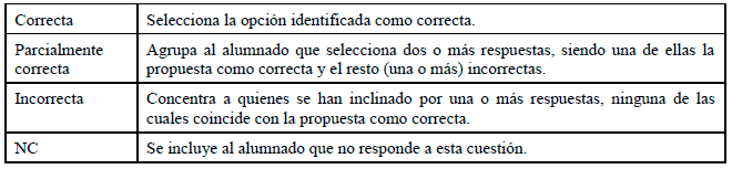 La clasificación empleada para categorizar las respuestas del alumnado de este último bloque fue: adecuadas, inadecuadas o no contesta.
