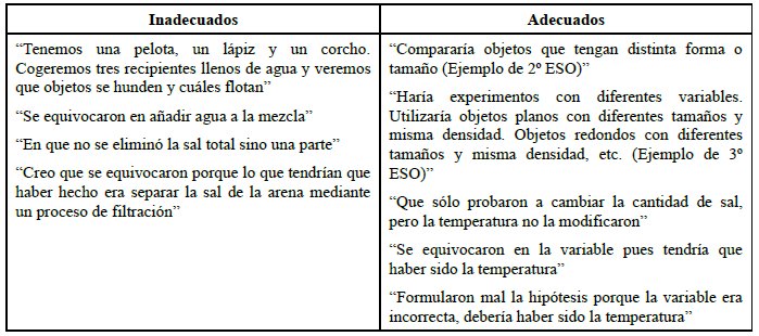 El rango tan amplio observado en 2º ESO pone de manifiesto la dificultad que esta destreza conlleva para el alumnado y que requiere dedicar un mayor tiempo de trabajo para lograr un mejor dominio de la misma. Como se muestra en la tabla 9, categorizamos como inadecuados los enunciados que no se formulan como hipótesis sino como resultados o explicaciones. Se consideran adecuadas todas aquellas respuestas con estructura de hipótesis y relacionadas con el tema a tratar, aunque sean incorrectas.