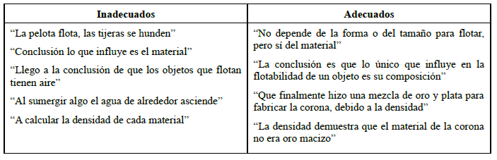 Se clasificaron como adecuadas aquellas respuestas que para el ítem C2.3 afirman que la magnitud que influye es la densidad o aquellos que, sin usar explícitamente este término, sí indican que el tamaño y la forma no son determinantes, sino que depende del material, y para el ítem C3.2 resaltaban que la densidad permitía determinar que la corona no era solo de oro. Se consideran inadecuadas las respuestas que no aportan una conclusión o cuya conclusión es incorrecta (tabla 11).