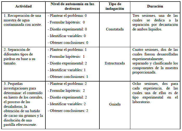 Las actividades fueron secuenciadas en orden creciente de dificultad con la finalidad de mostrar un equilibrio entre la autonomía requerida por parte del alumnado y las dificultades en el aprendizaje de destrezas (Ferrés et al., 2015). La propuesta comienza por una indagación constatada y finaliza en una guiada, progresando y avanzando, en las tareas sucesivas, en su forma de elucidar las respuestas a los problemas planteados y alcanzando una mayor autonomía en las tareas finales, exceptuando el nivel de indagación abierta.