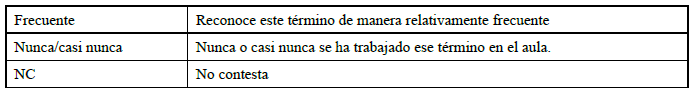 Por otro lado, las autopercepciones y los resultados de aprendizaje se evaluaron mediante la implementación del cuestionario pre-test y post-test. La primera parte trataba de conocer si durante la enseñanza recibida hasta el momento, había sido más o menos habitual la utilización de términos comúnmente empleados en las investigaciones escolares, concretamente: hipótesis (A1), diseño experimental (A2) y variable (A3). Para ello, el alumnado debía seleccionar, para cada uno de los términos, si lo había empleado: “con mucha frecuencia”, “alguna”, “casi nunca”, “nunca” o “no entiendo lo que se me pregunta”. Las respuestas fueron agrupadas en 3 categorías (Tabla 2).