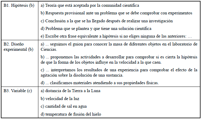 En un segundo bloque, se pretendía reconocer si el alumnado identificaba adecuadamente los conceptos “hipótesis”, “diseño experimental” y “variable” (ítems B1-B3, respectivamente) con expresiones relacionadas con su significado. Para ello, se ofrecía una serie de opciones en cada caso, de las cuales debían seleccionar las consideradas correctas (Tabla 3).