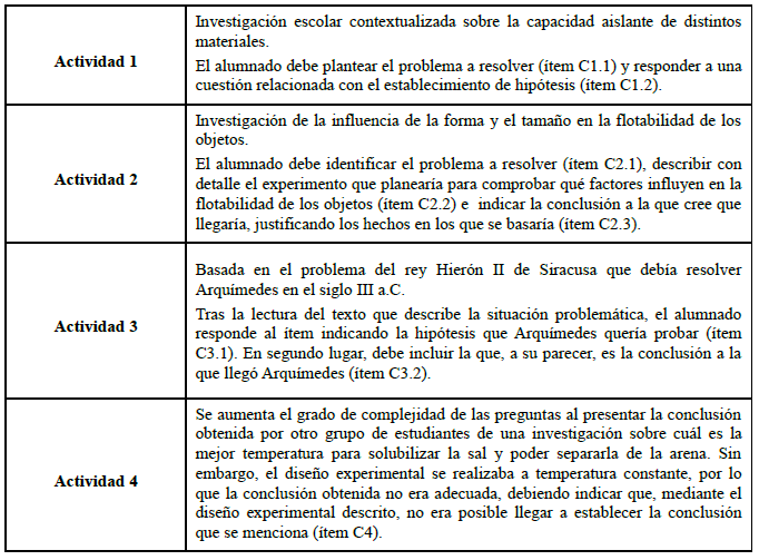 Las actividades fueron diseñadas en orden creciente de autonomía (Contrera et al., 2019) con la intención de que el alumnado de 2º y 3º de la ESO, respectivamente, se familiarizase, de forma progresiva, con ciertas destrezas de indagación (National Research Council, 2000) y se pueden consultar en el siguiente enlace: