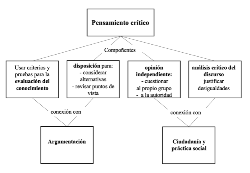 Proponemos utilizar la caracterización (ver Figura 1) de Jiménez-Aleixandre y Puig (2022), en la que el PC incluye una serie de componentes relacionados con el juicio deliberado (argumentación); y otra serie de componentes relacionados con la educación para la ciudadanía, y que integra: la capacidad para desarrollar una opinión independiente y desafiar ideas establecidas social y culturalmente, así como para analizar y criticar discursos que justifican las desigualdades sociales (Fairclough, 1995).