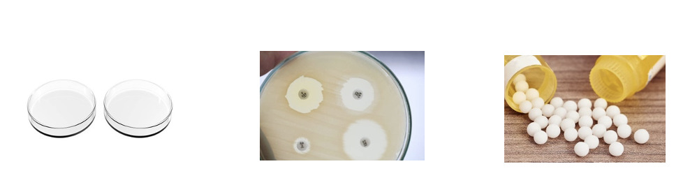 En esta tarea planteamos el siguiente interrogante, ¿Podemos comprobar de manera experimental la acción de un complejo homeopático frente a un medicamento? Pedimos al alumnado que en grupos debatan esta pregunta y a continuación, les damos una serie de materiales para que de manera experimental puedan resolver la cuestión anterior. Con el objetivo de poder comparar la acción del medicamento frente al complejo homeopático seleccionamos: un antibiótico de amplio espectro como la amoxicilina y un complejo homeopático que dice actuar frente un gran abanico de síntomas similares al del antibiótico proporcionado. Los materiales proporcionados son 4 placas Petri con cultivo, 1 disco de amoxicilina (antibiótico), 1 pastilla de compuesto homeopático (ver figura 2).