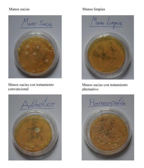 Tal y como muestran las imágenes, en la placa de manos sucias con homeopatía emergen un gran número de microorganismos, frente a la que contiene el antibiótico. El alumnado ha de extraer sus propias conclusiones y decidir qué recomendar a un amigo/a.