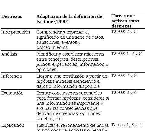 Para poder identificar qué destrezas de PC es capaz de movilizar el alumnado, proporcionamos a los/las estudiantes la tabla 1 en la que se describen las destrezas de PC, adaptadas de la caracterización de Facione (1990), eliminando la tercera columna.