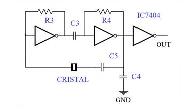 El diagrama esquemático del circuito oscilador con configuración en paralelo es mostrado en la figura 2, fue diseñado para operar con un valor de oscilación de 10 MHz usando ICs de tipo CMOS (74LVC1XG04) y de tipo TTL (74HC04 y 74LS04), utilizado en las investigaciones de Mista et al. (2016), Wei (2016), y Jayasvasti et al. (2017).