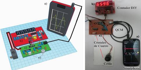 Las QCM están principalmente conformados por: dos circuitos osciladores, celdas con cristales-AT, fuentes de alimentación, unidades de control, computadoras personales (PC), frecuencímetros (Kamel et al., 2013), osciloscopios, bombas de vacío, y bombas peristálticas.