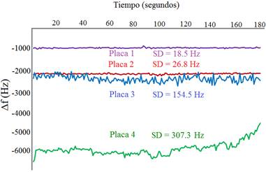 Los estudiantes en trabajo colaborativo ensamblan una QCM (ver figura 3) con uno de los cuatro circuitos osciladores presentados en la tabla 1. Se enciende la QCM sin colocar muestra en el cristal HC49U sin cobertura. Posteriormente con ayuda de un frecuencímetro de bajo costo se registran en una hoja de cálculo 180 lecturas de Δf. Luego los estudiantes calculan la desviación standard (SD) de Δf, y exponen sus hallazgos. Finalmente el profesor de manera gráfica compara la estabilidad entre las QCM, y realiza un debate entre los estudiantes ¿Cuál QCM presenta los valores de Δf, más estables? ¿Por qué? La figura 5 muestra los valores de Δf obtenidos en un ensayo.