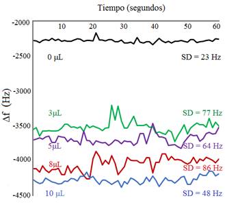 Los estudiantes en trabajo colaborativo ensamblan una QCM (ver figura 4) usando los circuitos osciladores de la placa 2 (ver tabla 1). El experimento inicia cuando un integrante del grupo enciende la QCM sin colocar muestras en el cristal resonador, mientras otro estudiante graba en un minuto de video el frecuencímetro, otro estudiante registra 60 lecturas de Δf en una plantilla de cálculo. Posteriormente se repetirá esta acción cuatro veces colocando muestras de agua pura a (3, 5, 8, 10 μL) previa limpieza del cristal con un hisopo impregnado con propan-2-ol (alcohol isopropílico) antes de cada ensayo. Finalmente los estudiantes expondrán sus resultados y mostraran una gráfica el desempeño de su QCM al medir Δf a distintos volúmenes. La figura 7 muestra los valores de Δf obtenidos en un ensayo.