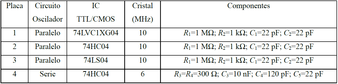 Para el diseño de los dos circuitos osciladores se presentan cuatro opciones con configuraciones en serie y paralelo (figura 1 y figura 2) impresas en cuatro placas usando dos IC de la familia 7404, resistencias y condensadores (ver tabla 1).