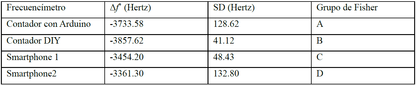Los resultados obtenidos en el ensayo (figura 6 y tabla 2) demuestran que los frecuencímetros pueden emplearse con fines didácticos, porque son capaces de medir la frecuencia de resonancia en una QCM. Las pruebas estadísticas ANOVA (p<0.05) y agrupación de FISHER demuestran que hay diferencias en el funcionamiento entre los frecuencímetros.