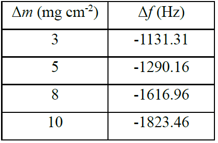 Para obtener la relación entre Δm y Δf (tabla 3) se debe considerar la densidad del agua 1 g mL-1, y la superficie del cristal 1 cm2, tener presente que las muestras no formaron películas infinitesimalmente delgadas en el cristal, y también que este ensayo se ha realizado en condiciones ambientales. Por lo que es necesario restar el primer valor de Δf = -2280.21 Hz a las muestras de (3, 5, 8, 10 μL). La QCM con materiales de bajo costo presenta limitaciones por lo que se presenta en este estudio solo con fines didácticos. Por este motivo para que los estudiantes puedan evaluar sus resultados obtenidos se sugiere aplicar el modelo de regresión a los datos obtenidos y comparar el valor de sus pendientes. Así en este ensayo se obtuvo la ecuación de una recta con un coeficiente de determinación (R2) de 0.9868, una pendiente de 100.44 Hz mg-1, y un intercepto de -812.63 Hz con los datos de la tabla 3.