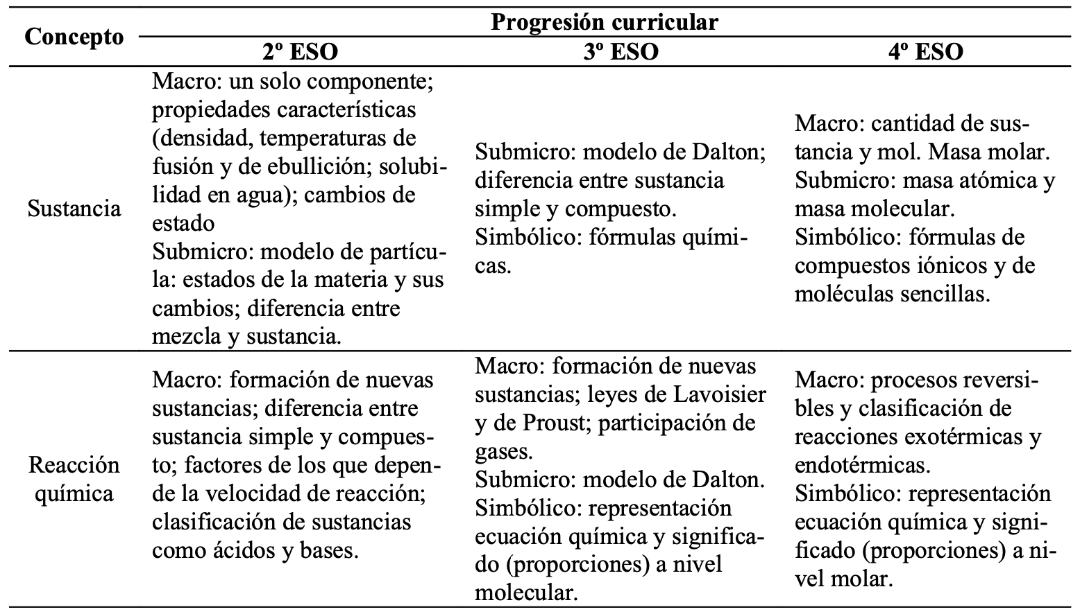 El orden con el que se presentan estos dos conceptos y su acotación curricular resultan adecuados para su progresiva construcción conceptual: el estudio del concepto de sustancia precede en cada nivel al de reacción química. Además, inicialmente, el enfoque es exclusivamente macroscópico, incorporándose paulatinamente la conceptualización submicro y la representación simbólica.
