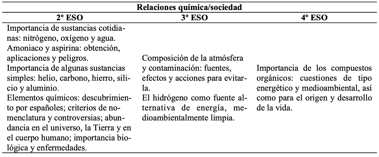 La construcción del pensamiento químico la complementa con el conocimiento de aspectos socio científicos concretos, sobre lo que el currículum del Ministerio de Educación sólo realiza apreciaciones genéricas. En la Tabla 2 se distribuye por cursos esta dimensión química/sociedad. Se aprecia un mayor énfasis al principio, quizás como elemento inicial de ayuda motivacional. Si bien esta reducción gradual parece pertinente, ya que posibilita tratar adecuadamente el resto de contenidos especificados en el escaso tiempo disponible, la extensión de su alcance curricular suele ser objeto de debate entre el profesorado de ciencias experimentales.
