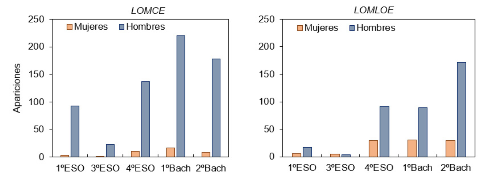 En los libros LOMCE se puede ver cómo, tras aumentar progresivamente de 1º ESO a 1º Bachillerato, las apariciones de mujeres disminuyen en 2º de Bachillerato a casi la mitad. Del mismo modo, también se aprecia un descenso en la presencia de apariciones de hombres en ese último curso. En lo que respecta a los libros de texto LOMLOE, se aprecia un aumento de la presencia de hombres, mientras que las apariciones de mujeres desde 4º ESO hasta 2º Bachillerato son muy similares.