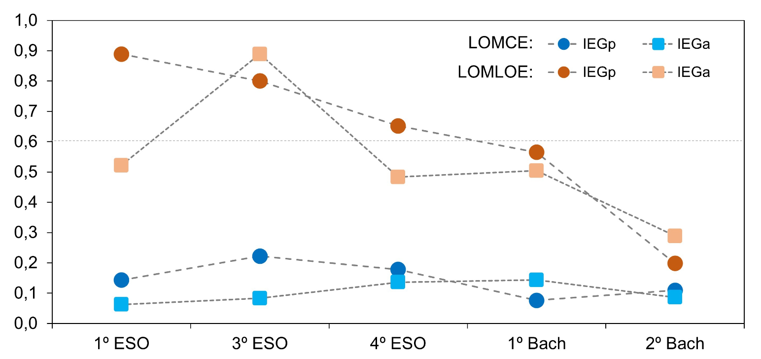 Por último, a partir de los datos de personajes y apariciones correspondientes a cada género, se puede calcular el Índice de Equitatividad de Género (IEG), cuya evolución por ley educativa y por curso se puede ver en la Figura 2. Este índice está mucho más cerca de uno (que correspondería a una presencia equitativa) en los libros publicados tras la implementación de la LOMLOE que en los de la LOMCE. Un valor de IEG superior a 0,6 mostraría una proporción representativa (López-Navajas, 2015), es decir, no habría una penalización de personajes o apariciones ni masculina ni femenina. Sin embargo, se observa una clara tendencia a disminuir la equitatividad según aumenta el nivel educativo, aproximándose los valores en 2º de Bachillerato a los de la legislación anterior.